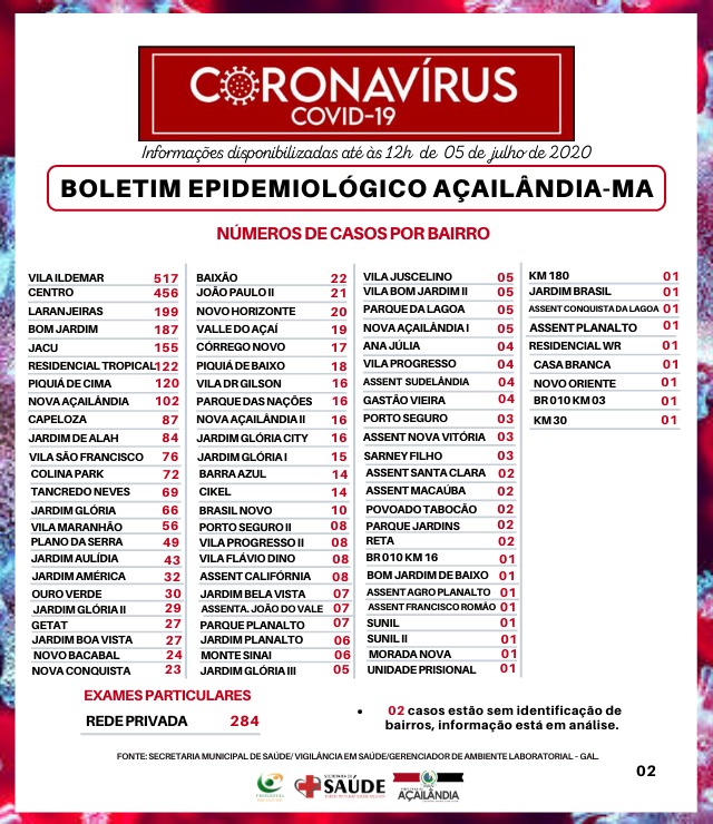 Devido a grande demanda de casos, a Secretaria de Estado de Saúde não está atualizando os dados de Açailândia.