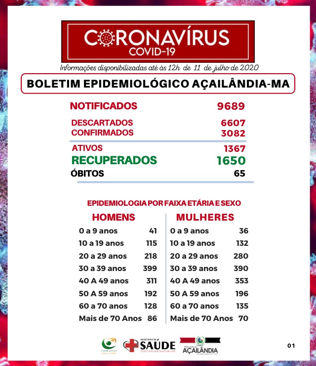 A Secretaria de Saúde informa no sábado, 11/07, até às 12h, temos registrados 9689 casos notificados com suspeita clínica e epidemiológica de infecção pelo novo coronavírus.