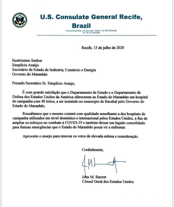 O secretário de Indústria e Comércio no Maranhão, Simplício Araújo, anunciou que o governo dos Estados Unidos vai doar um hospital de campanha para o combate a Covid-19 no Maranhão.