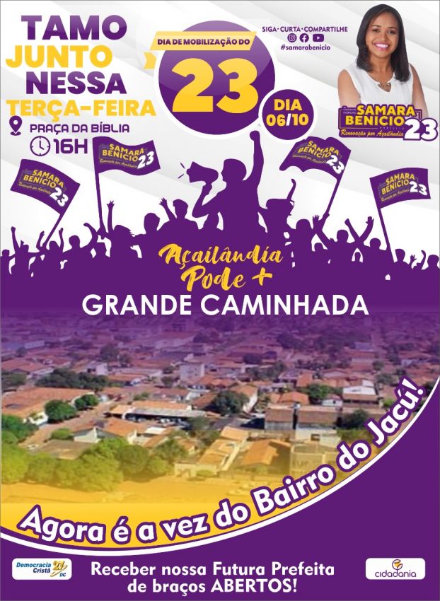 A caravana do 23 ,por onde passa é otimista e convicta de que Samara Benício 23, está preparada para administrar Açailândia como disse Samara 23; " tenho total convicção de que estou preparada para administrar Açailândia," afirmou Samara 23.